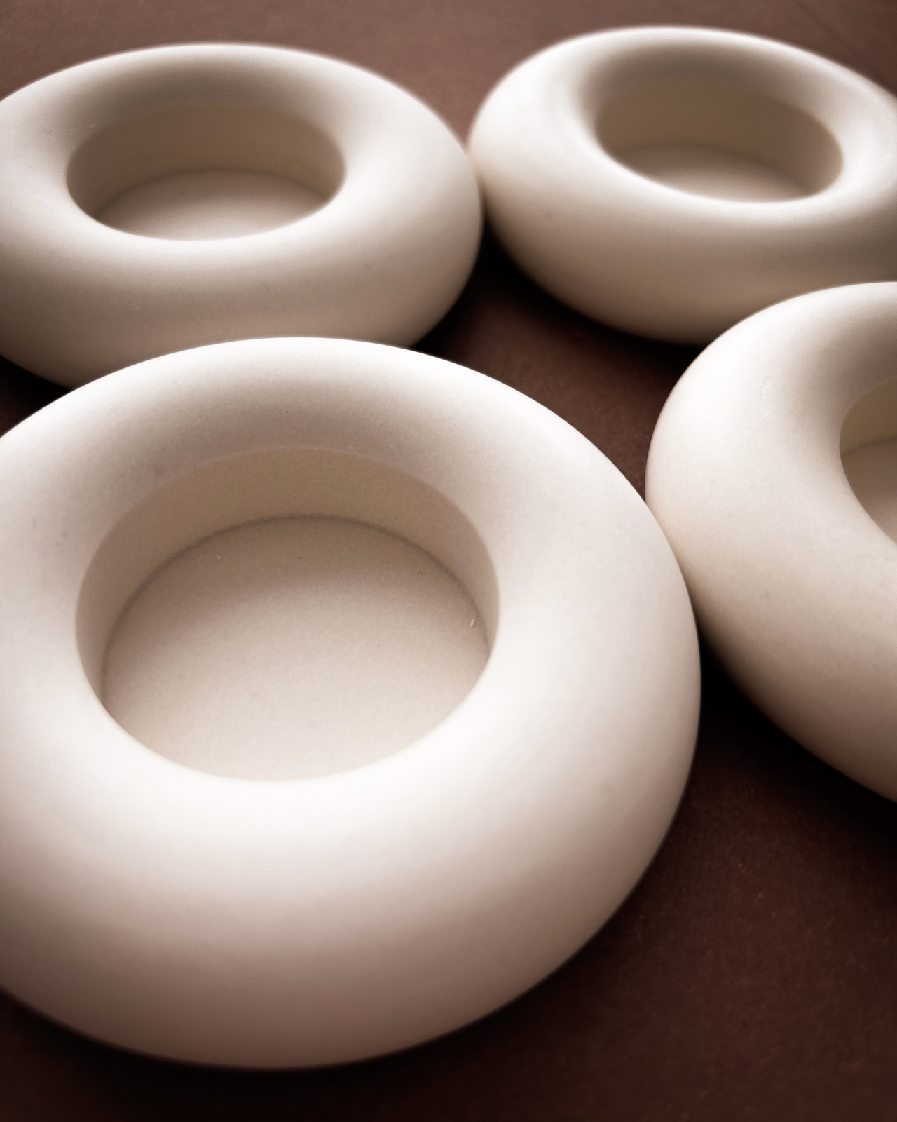 După turnare, fiecare piesă este atent șlefuită pentru a obține o suprafață netedă și uniformă, apoi este sigilată cu ceară naturală, oferind protecție împotriva umezelii și accentuând delicat nuanța materialului.